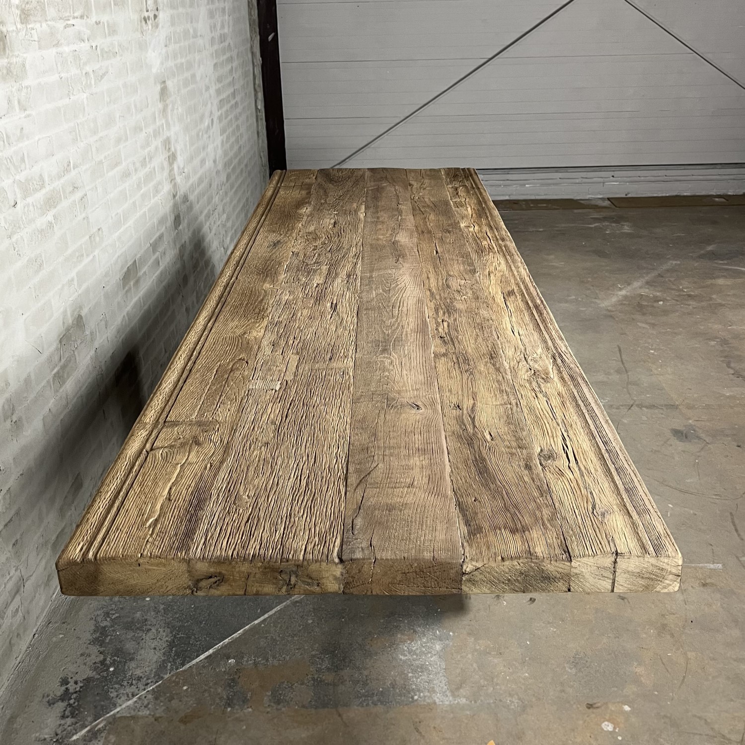 This height-adjustable table is made from a set of heavy cast-iron legs, adjustable from 77cm to 115cm high. Because the oak has been discoloured in the sun for decades as cladding, it has acquired a beautiful patina.