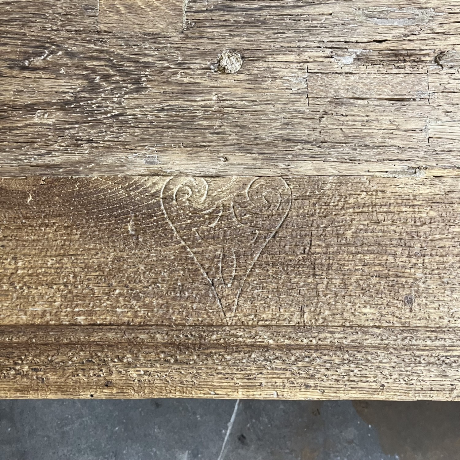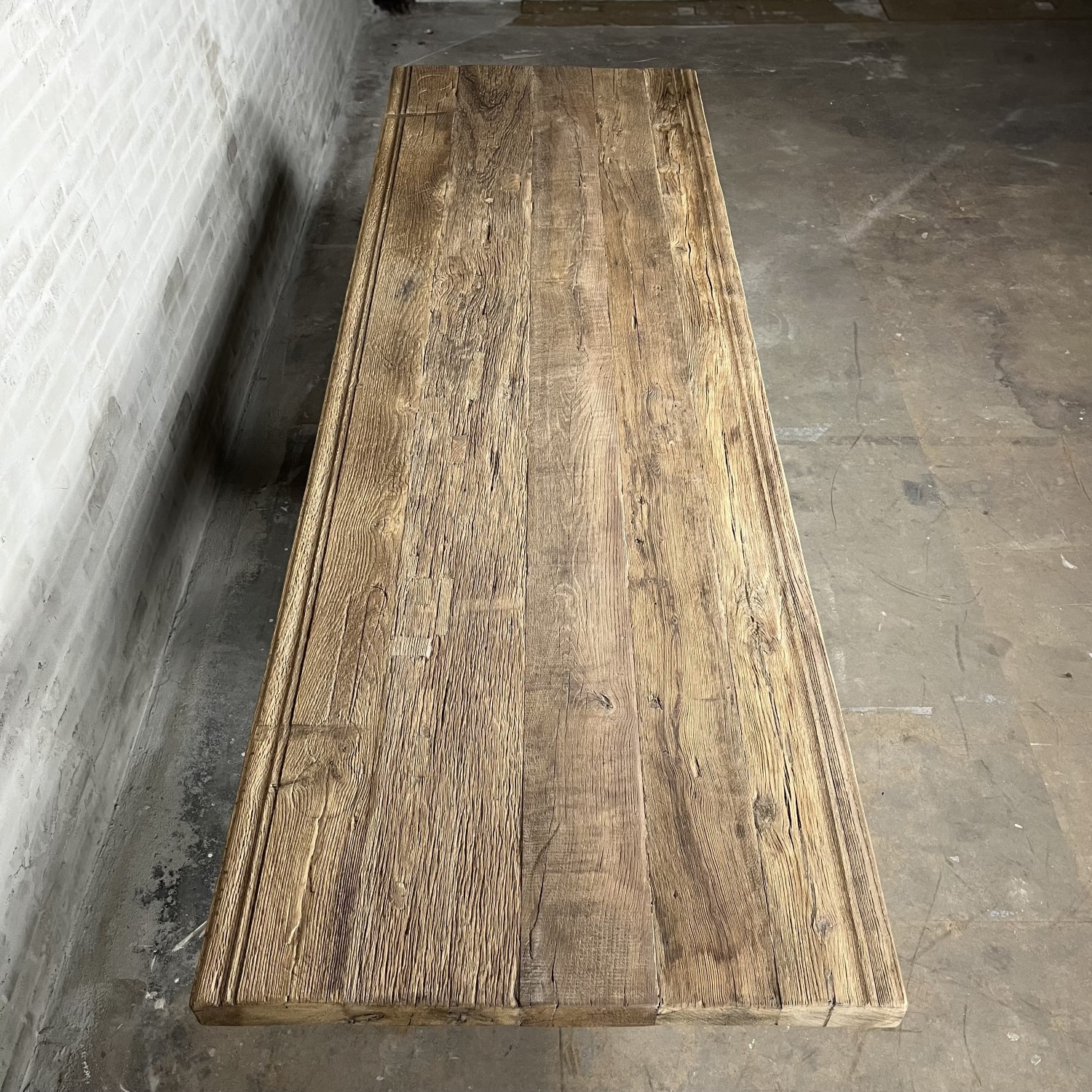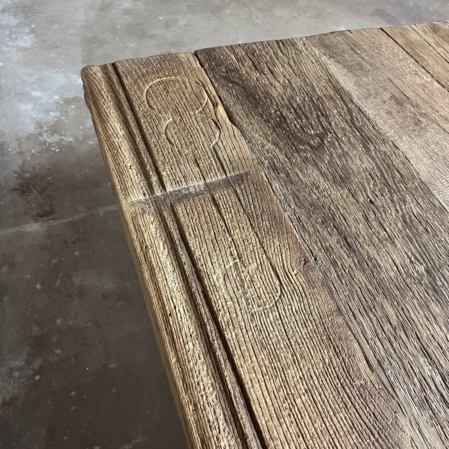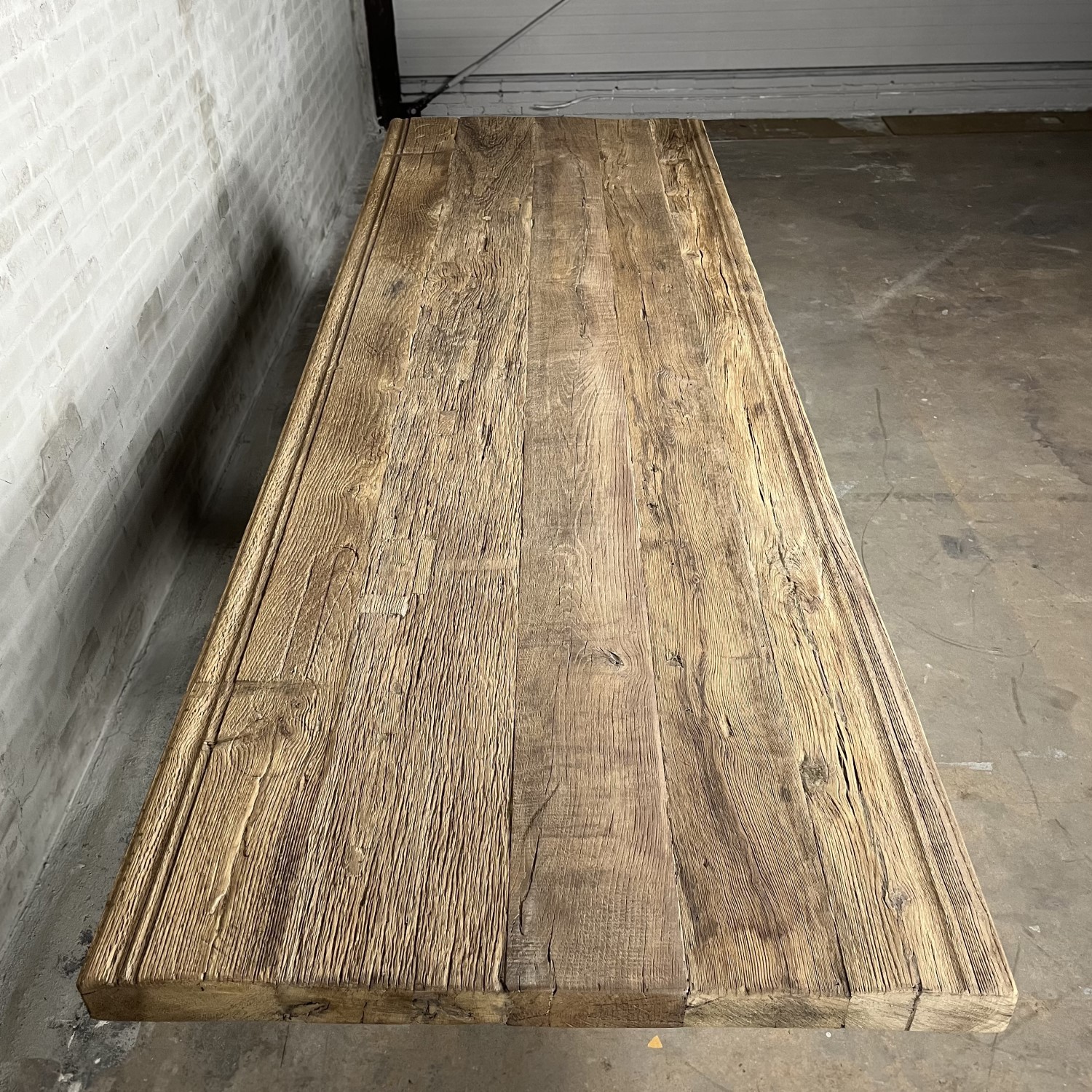 The sun-kissed oak is construction wood. Where there have been old joints, for example, there are holes in the planks. These holes are filled with wooden blocks of the same sun-bleached oak.