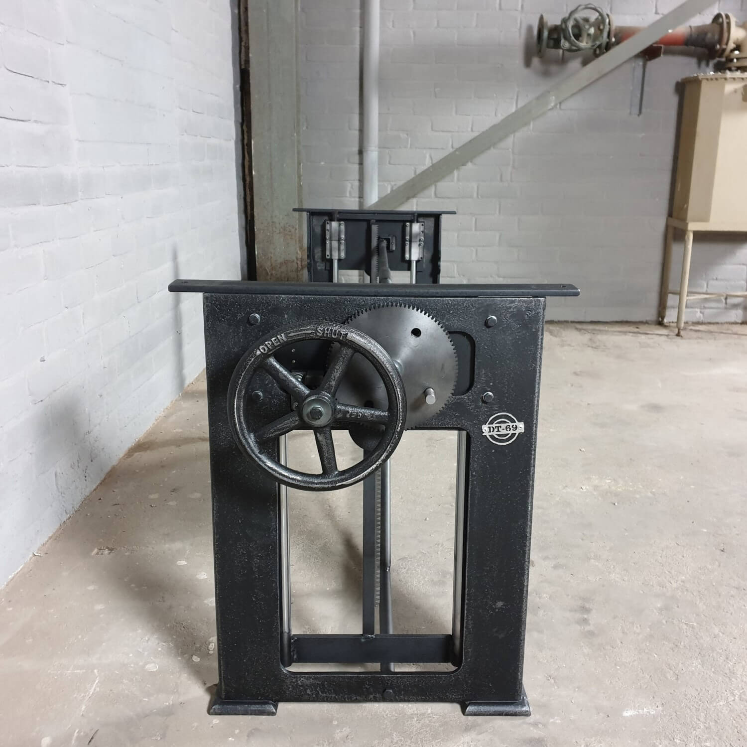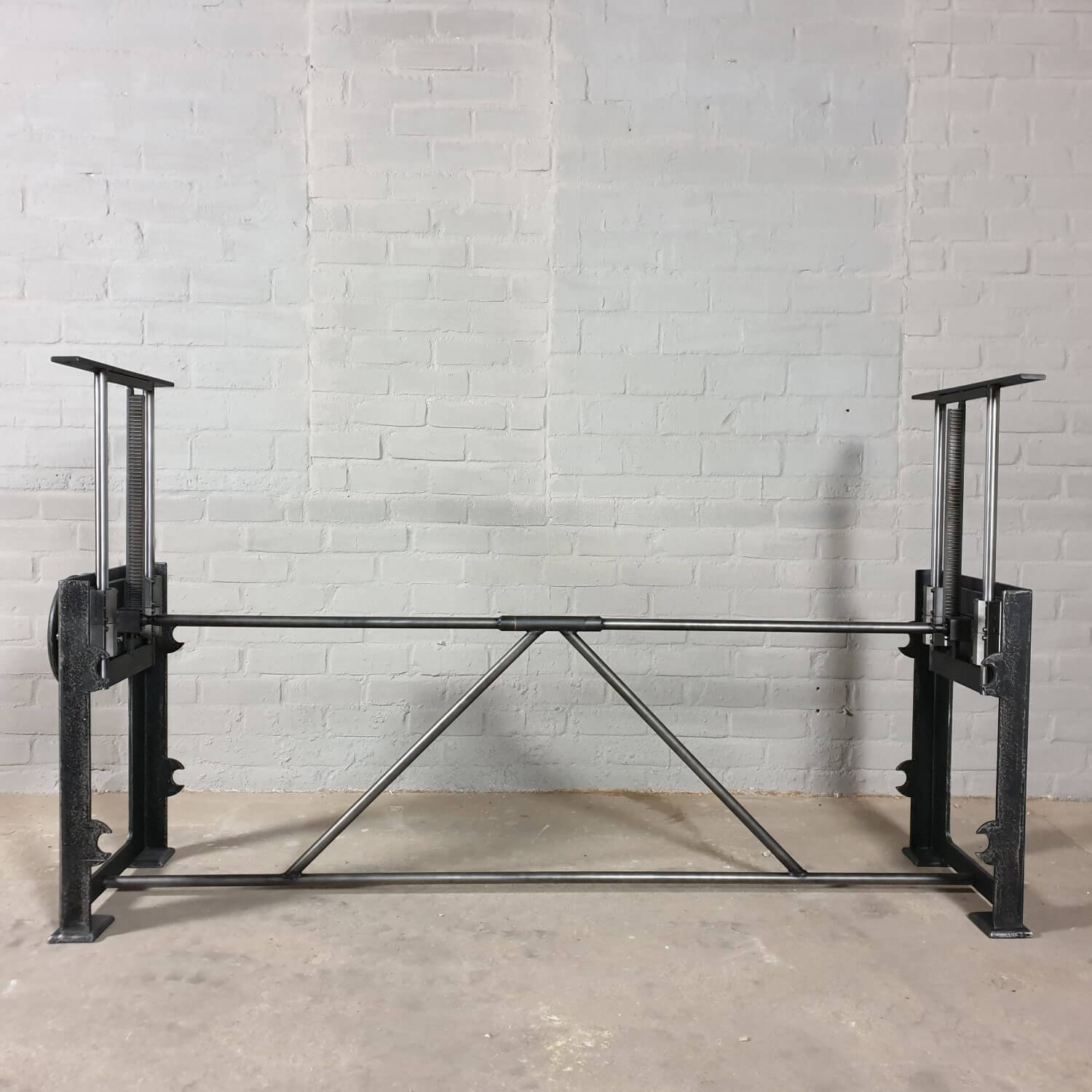 This industrial cast iron base has a height adjustable mechanism integrated into the table legs. This mechanism can be used to raise and lower a table top from a height of 71 cm to 112 cm. This way a table with this base can be used as a dining table (low) and as a bar table (high). But it can be used as kitchen table (low) and as a standing desk (high) aswell.