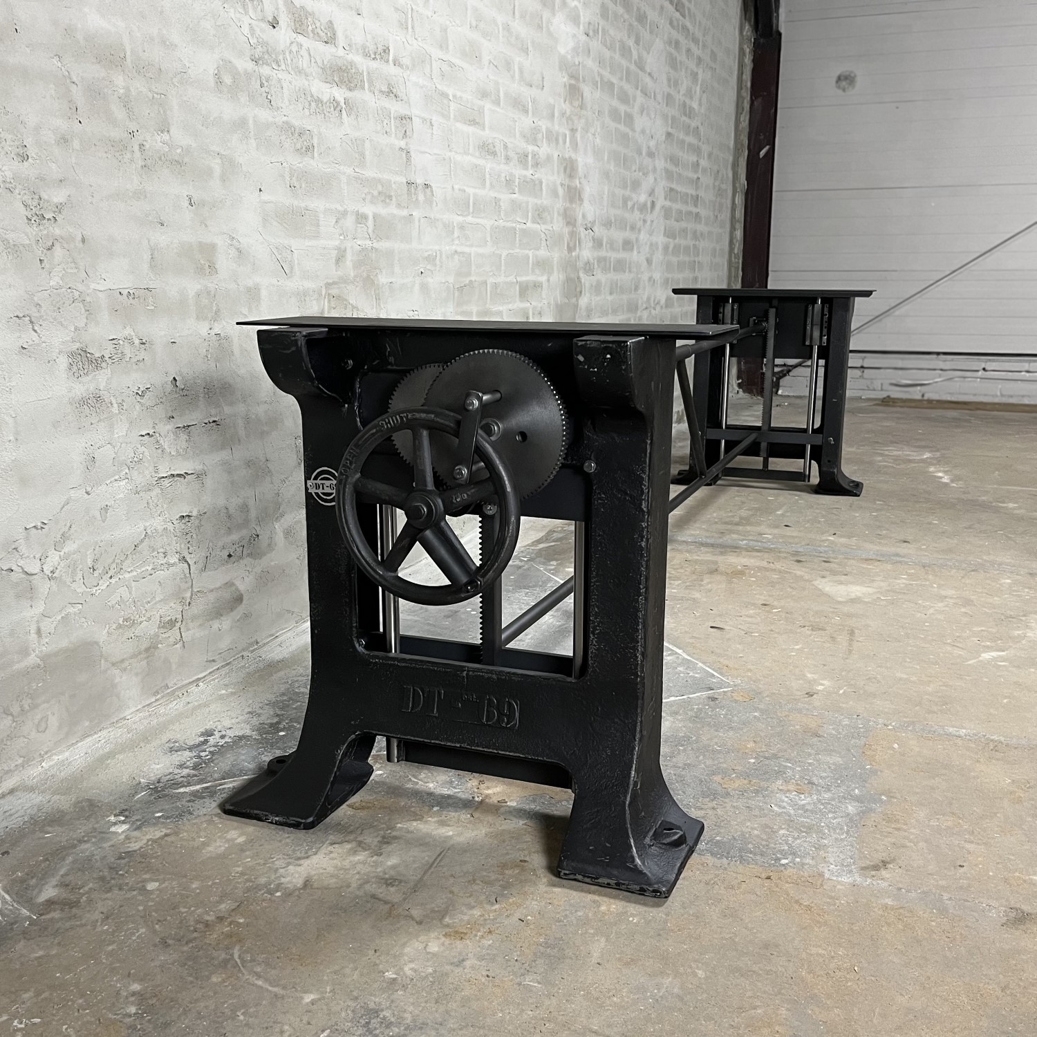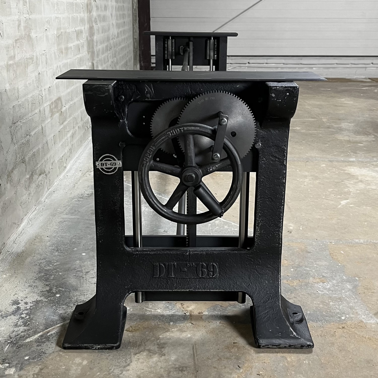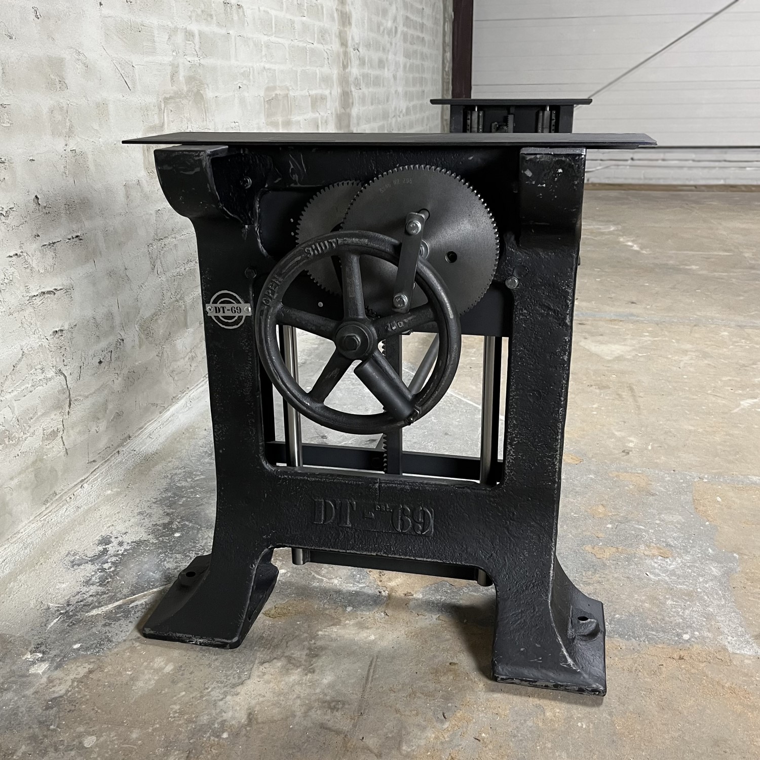 This industrial cast iron base has an in height adjustable crank base that is made in our own workshop according to traditional methods. Adjustable from 69cm to 110cm high. Can be used as a dining table (low) and with high stools as a bar (high).