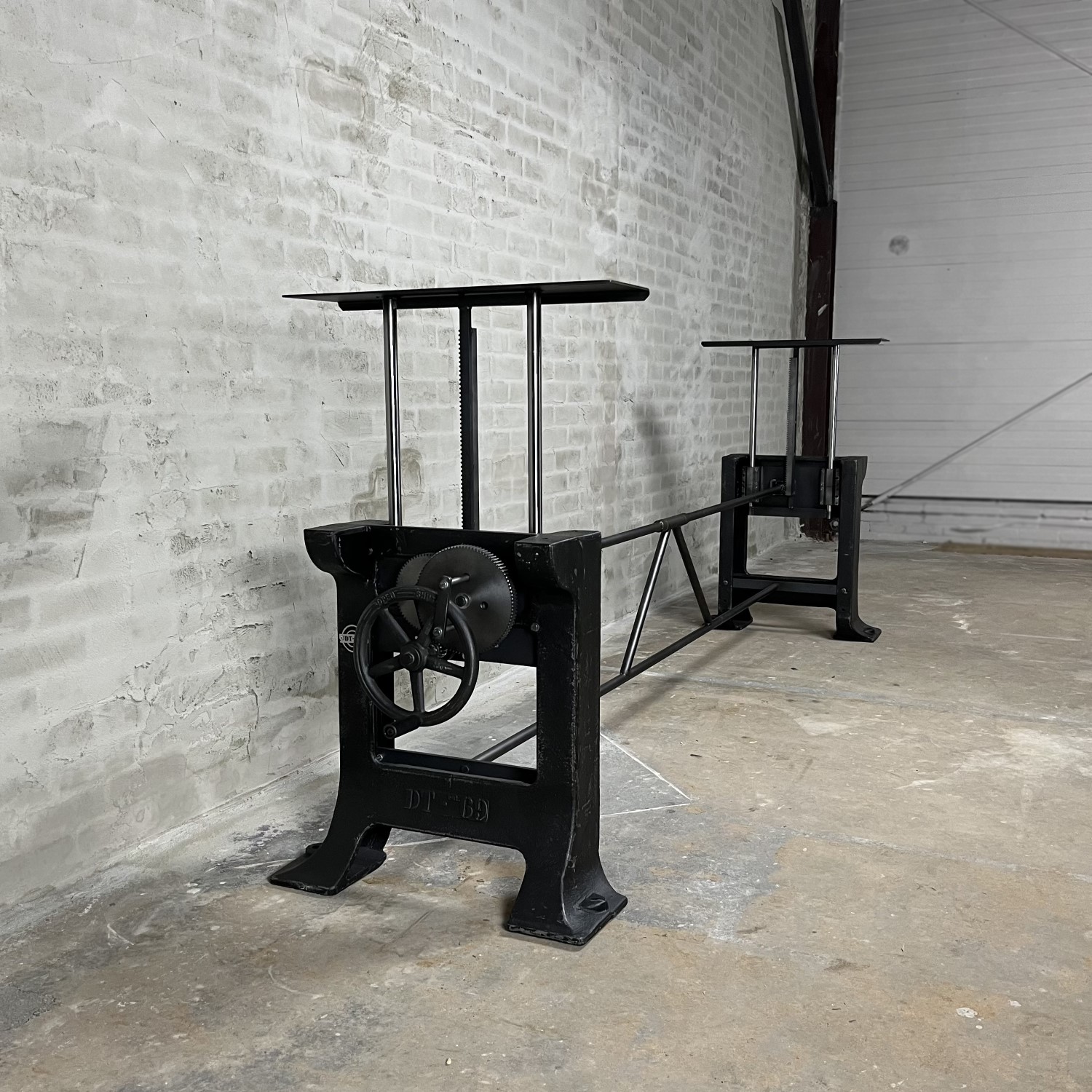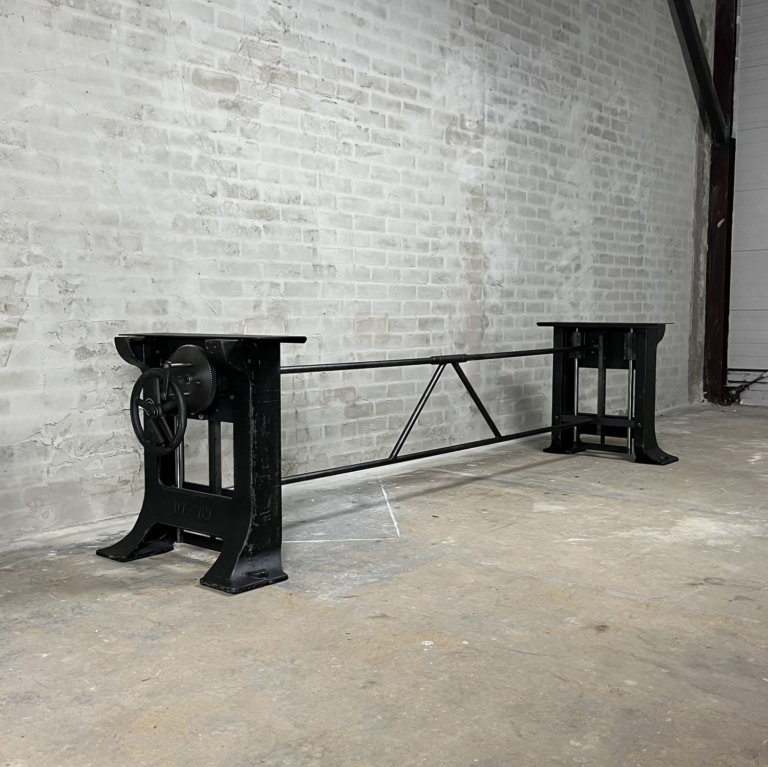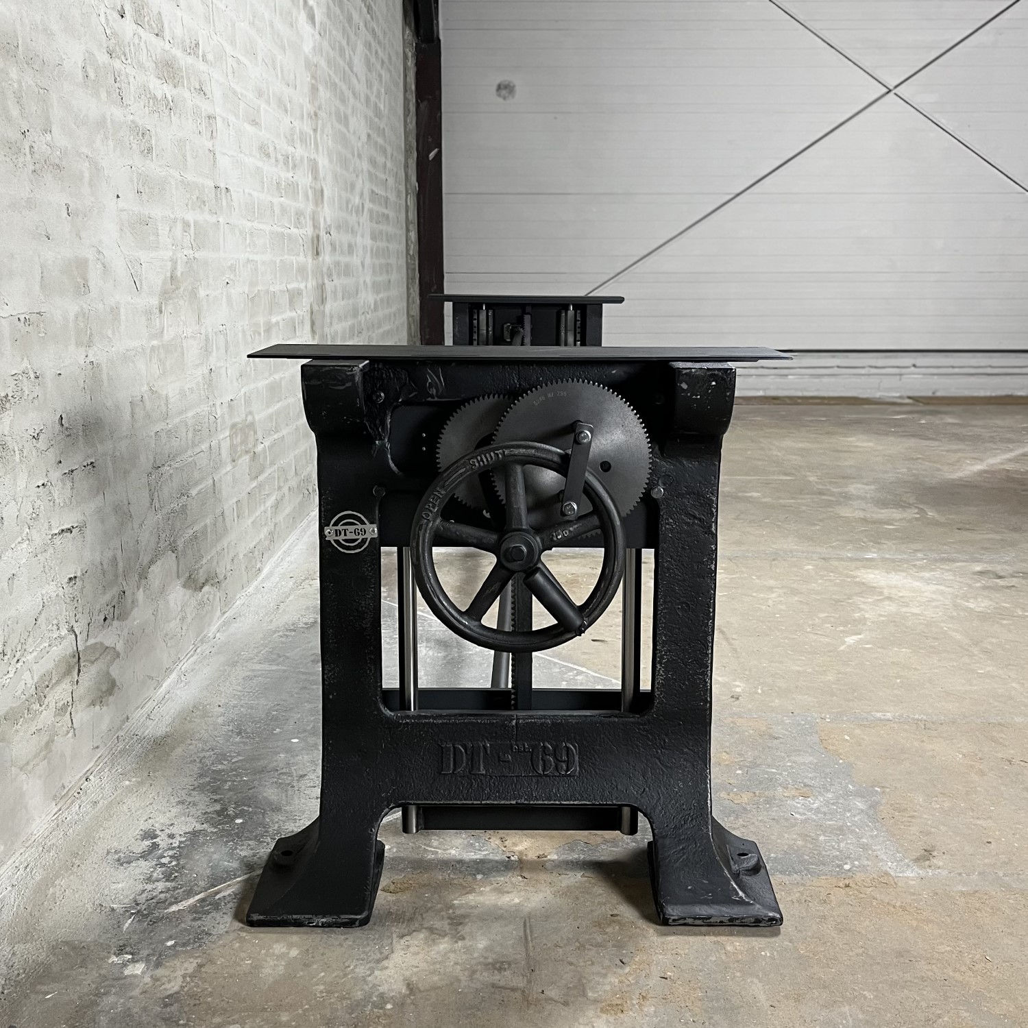 This industrial cast iron base has an in height adjustable crank base that is made in our own workshop according to traditional methods. Adjustable from 69cm to 110cm high. Can be used as a dining table (low) and with high stools as a bar (high).