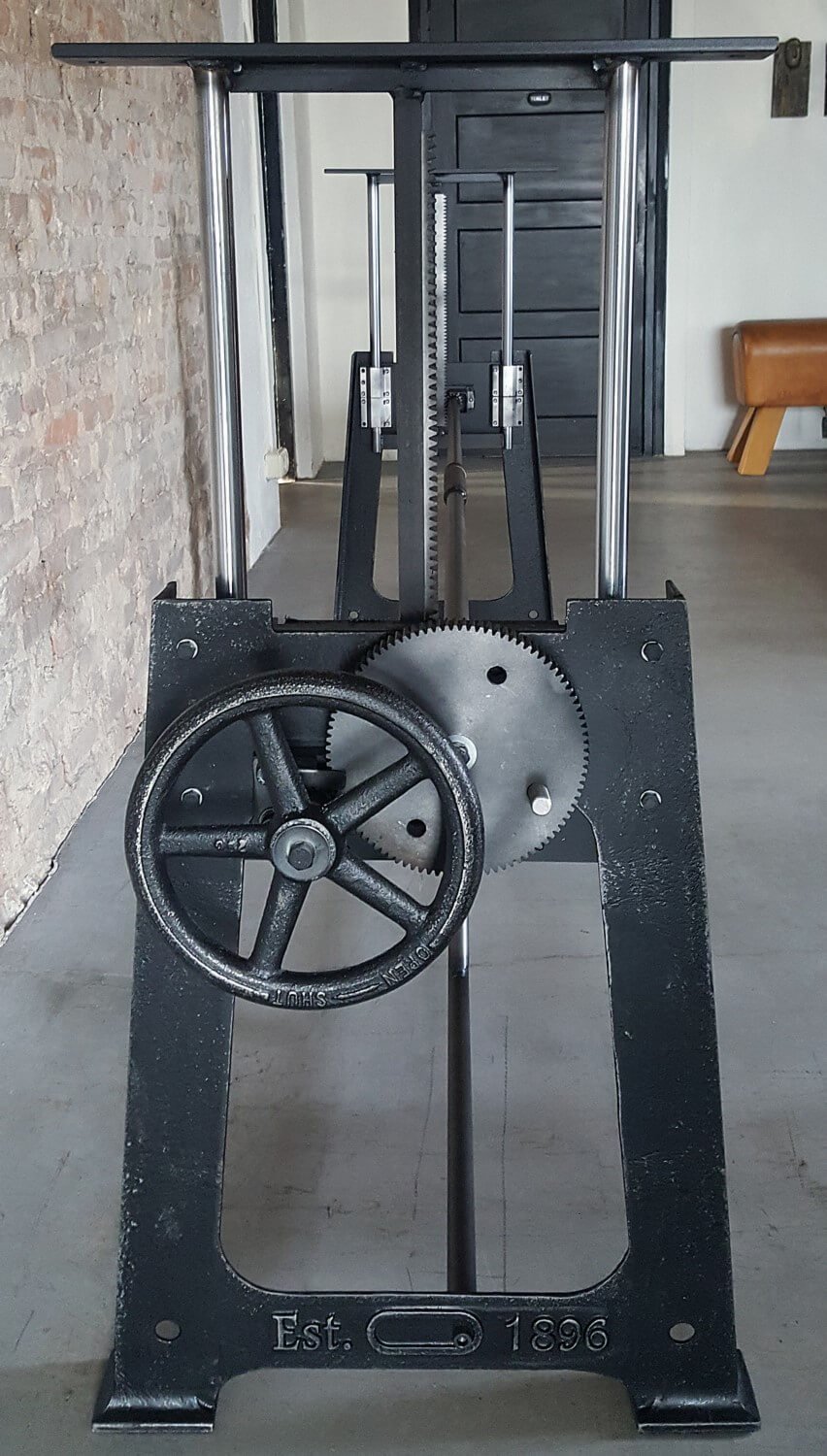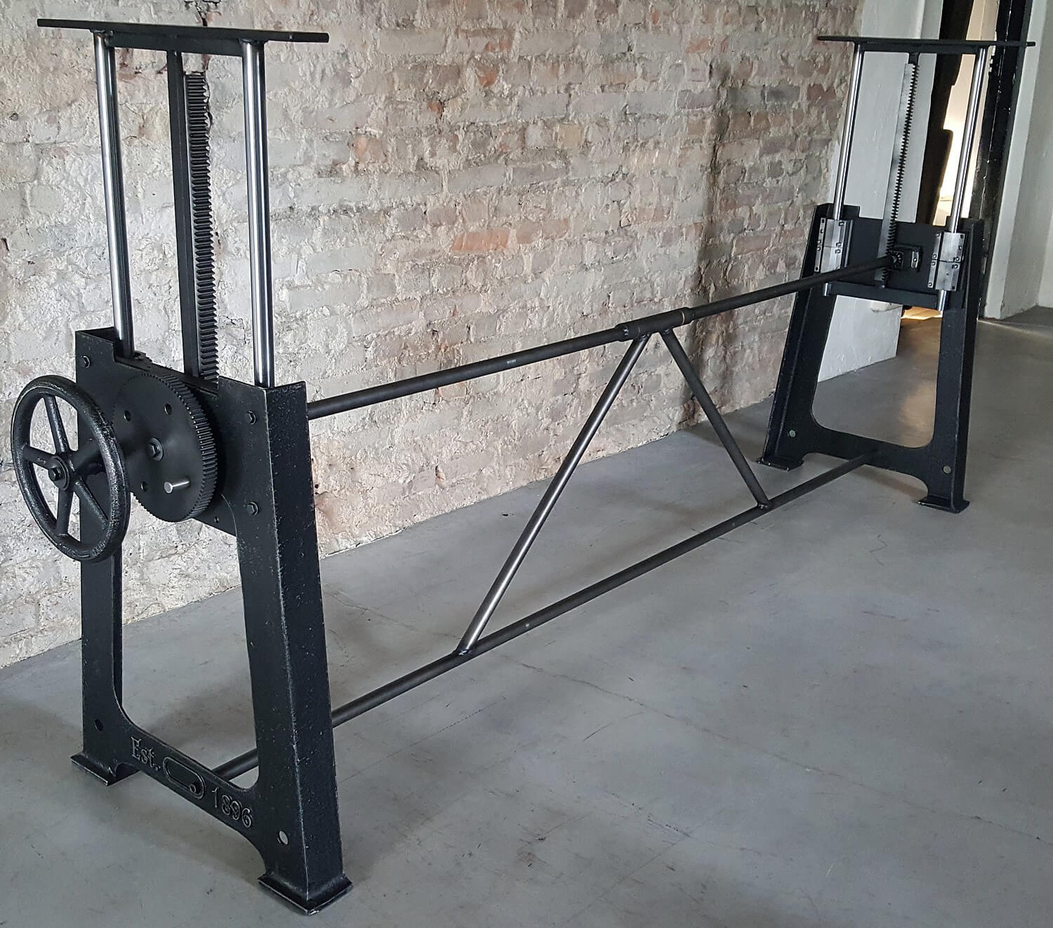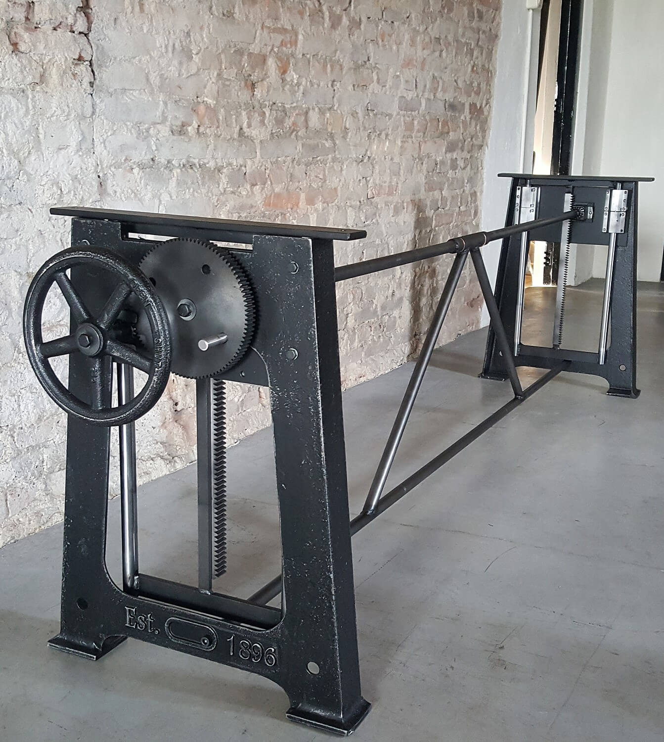 This industrial cast iron base has a height adjustable mechanism integrated into the table legs. This mechanism can be used to raise and lower a table top from a height of 71 cm to 112 cm. This way a table with this base can be used as a dining table (low) and as a bar table (high). But it can be used as kitchen table (low) and as a standing desk (high) aswell.