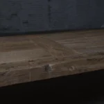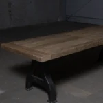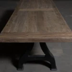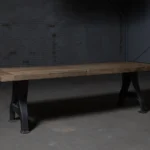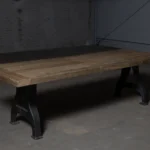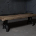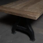 This table has an industrial cast iron base. The tabletop is 7cm thick and made of thin old sunburned oak (sawed from the outer layer of old beams) that is glued on a furniture board. The outer edges of the tabletop are made of solid planks. The sunburned oak boards are from old houses, and have a beautiful patina. tinted by the sun!