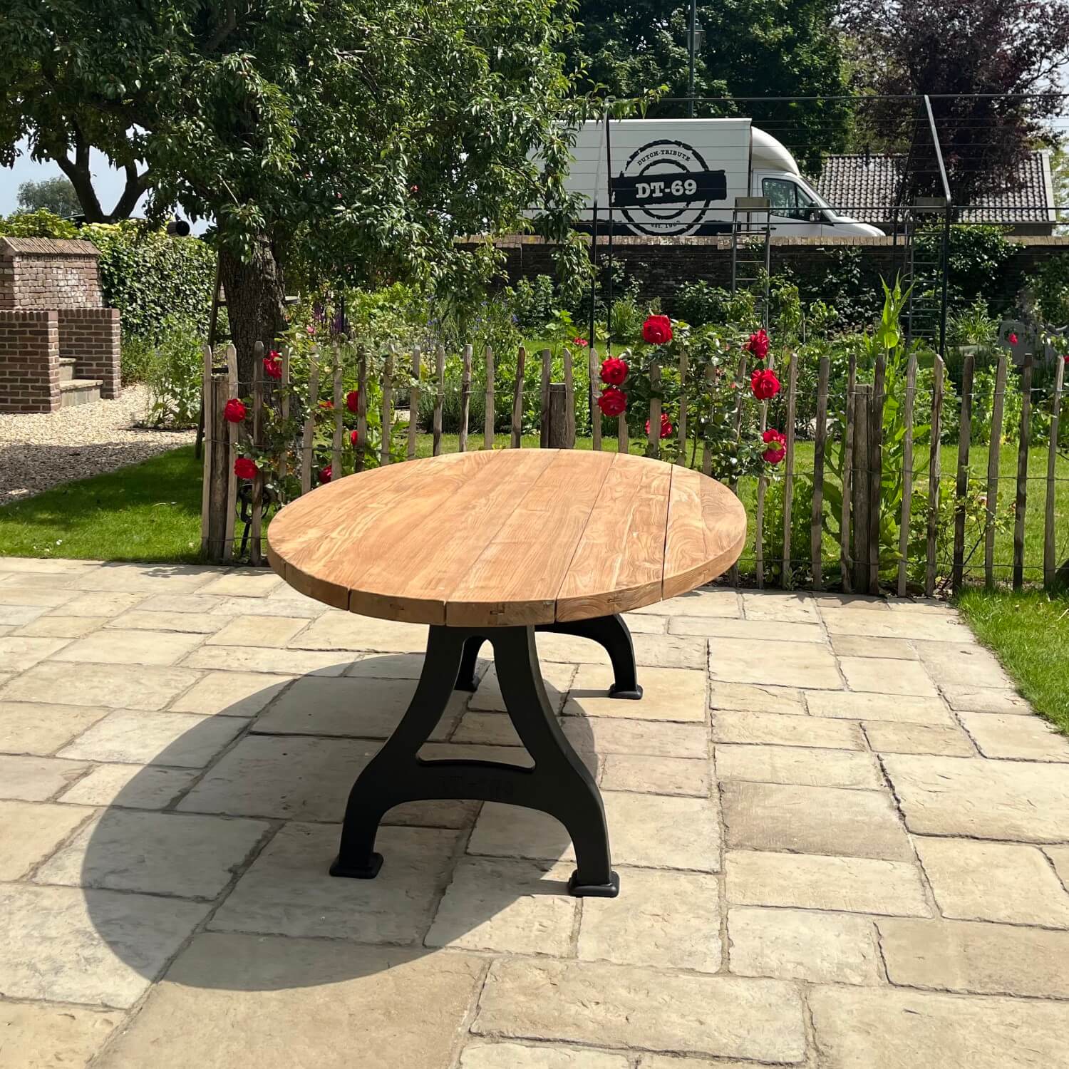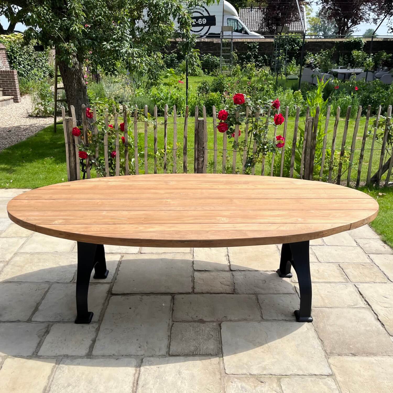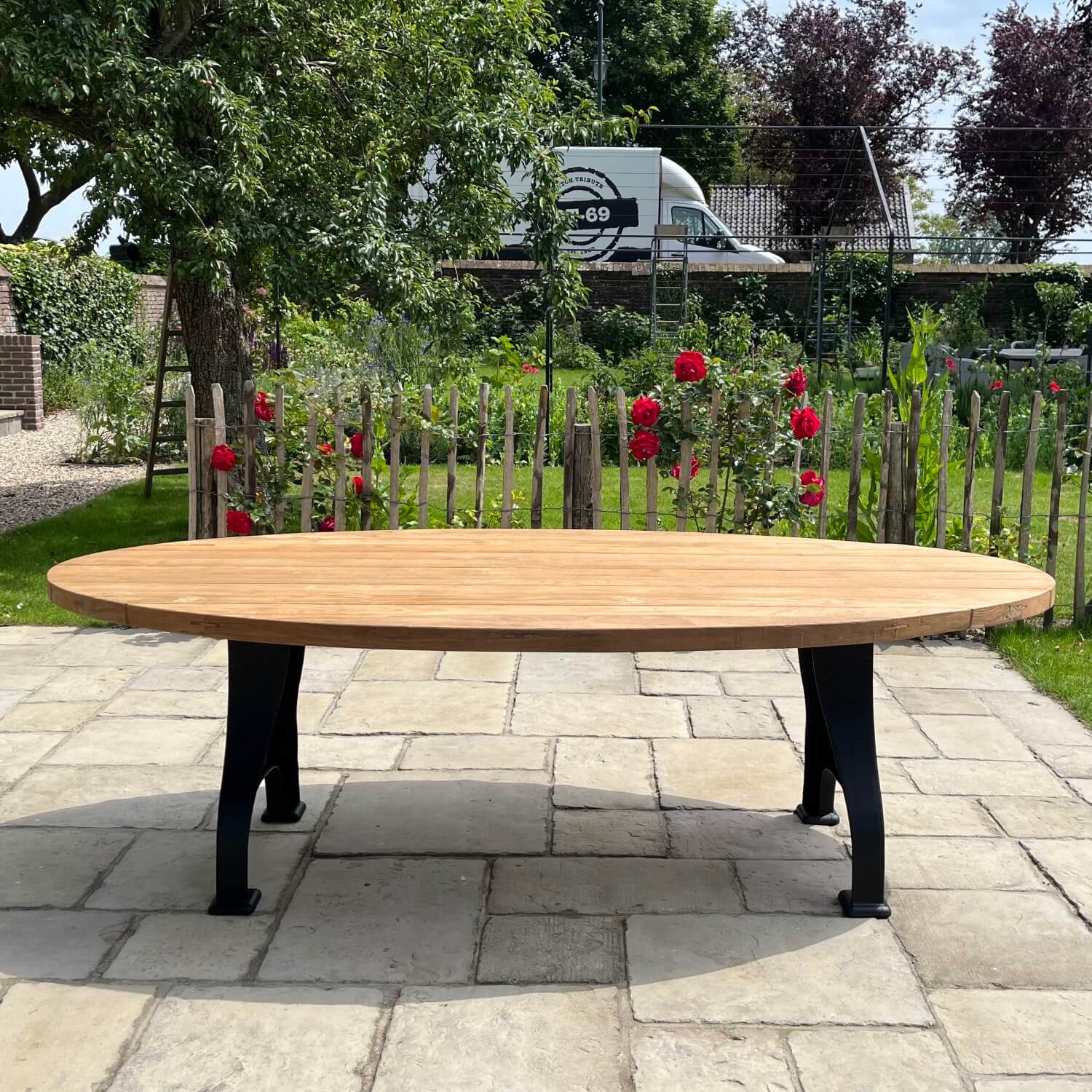 This industrial design oval garden table was designed by ourselves. The table has robust cast-iron legs and a tabletop made of teak, which guarantees a long lifespan. The wood is excellent for untreated use outdoor because it’s naturally protected against wood degradation. Untreated use gives the wood a beautiful natural look and will age over the years. You can also treat the teak with a teak oil to maintain the colour of the wood.