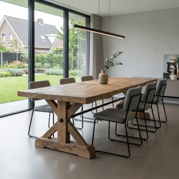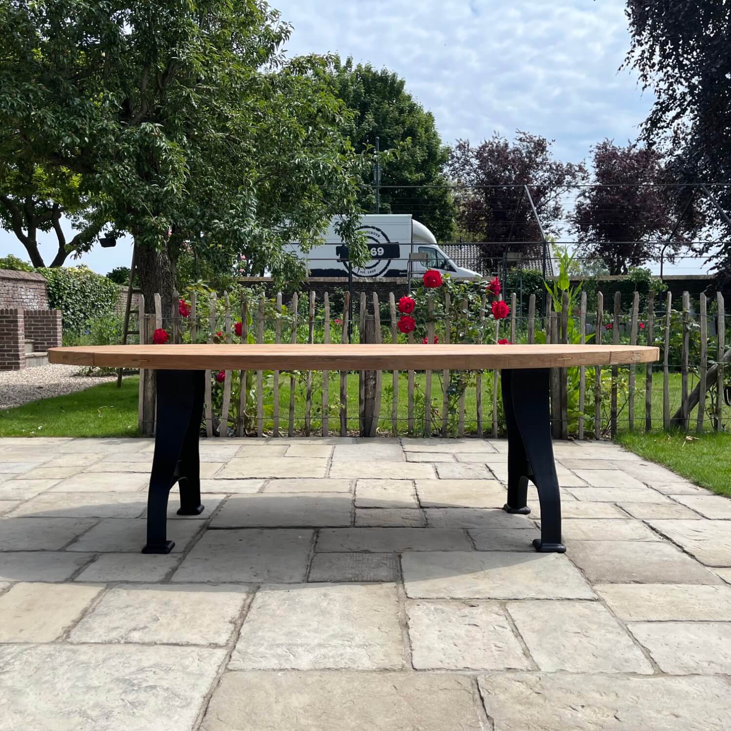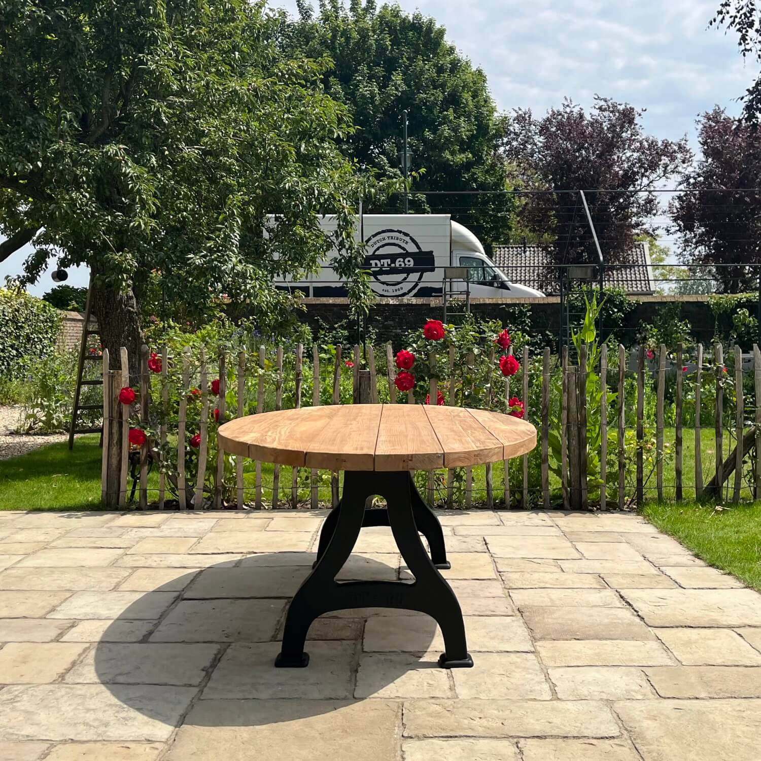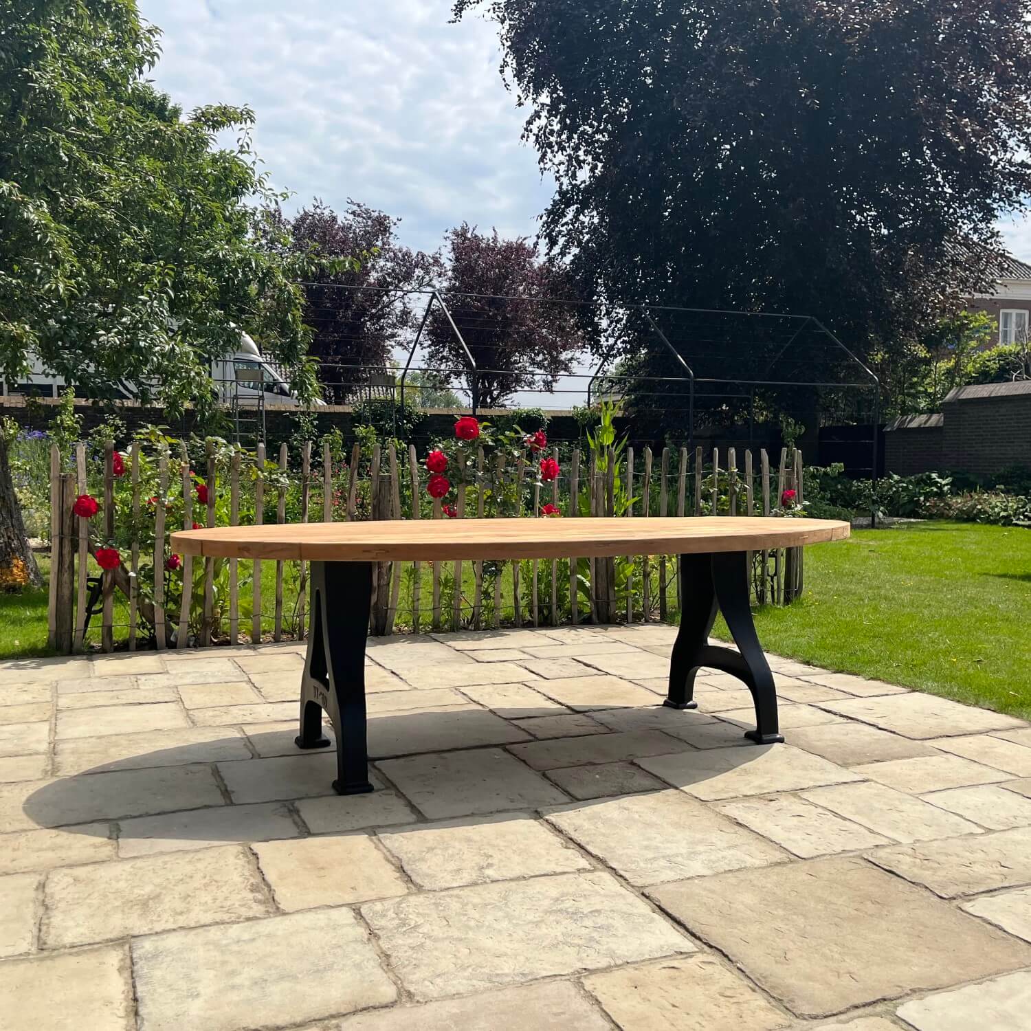 This industrial design oval garden table was designed by ourselves. The table has robust cast-iron legs and a tabletop made of teak, which guarantees a long lifespan. The wood is excellent for untreated use outdoor because it’s naturally protected against wood degradation. Untreated use gives the wood a beautiful natural look and will age over the years. You can also treat the teak with a teak oil to maintain the colour of the wood.
