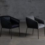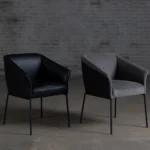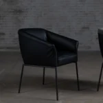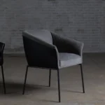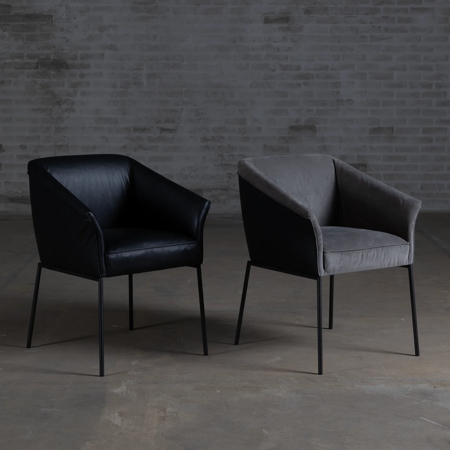 The Milo modern dining chair with armrest is furnished with airy seat cushions that spring deeply when you sit down. The chair has a backrest that extends into the armrests. Together with its thin steel base, the chair as a whole has a modern look.
