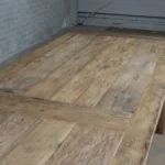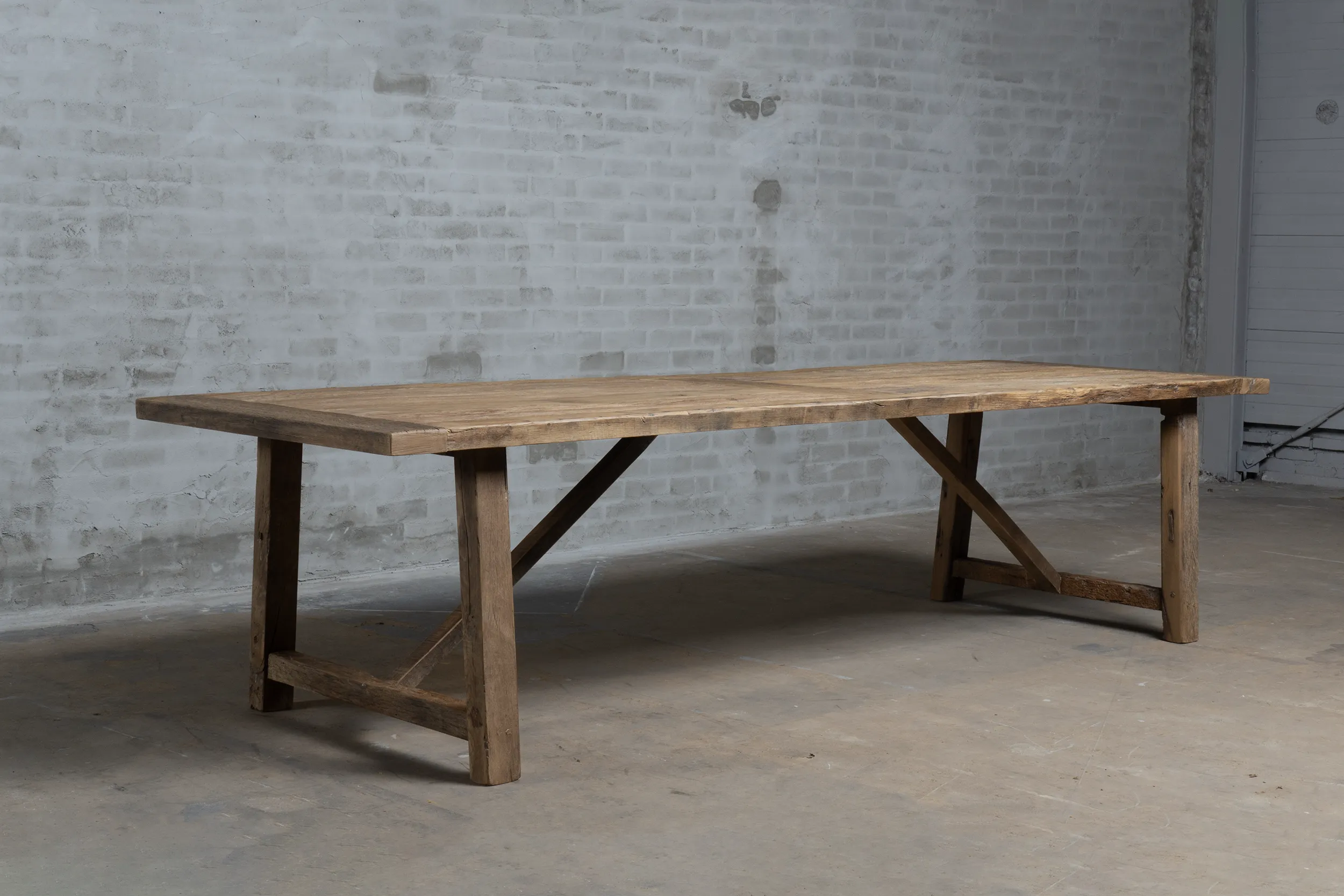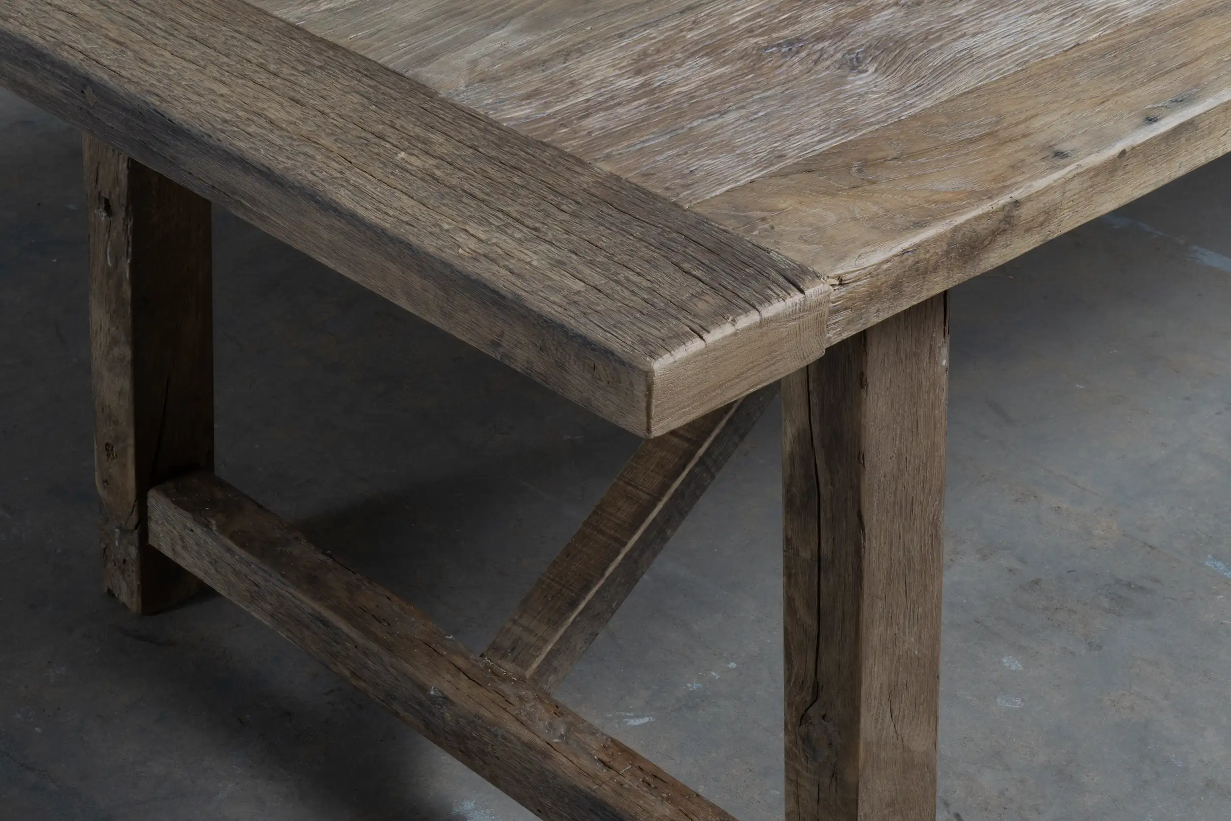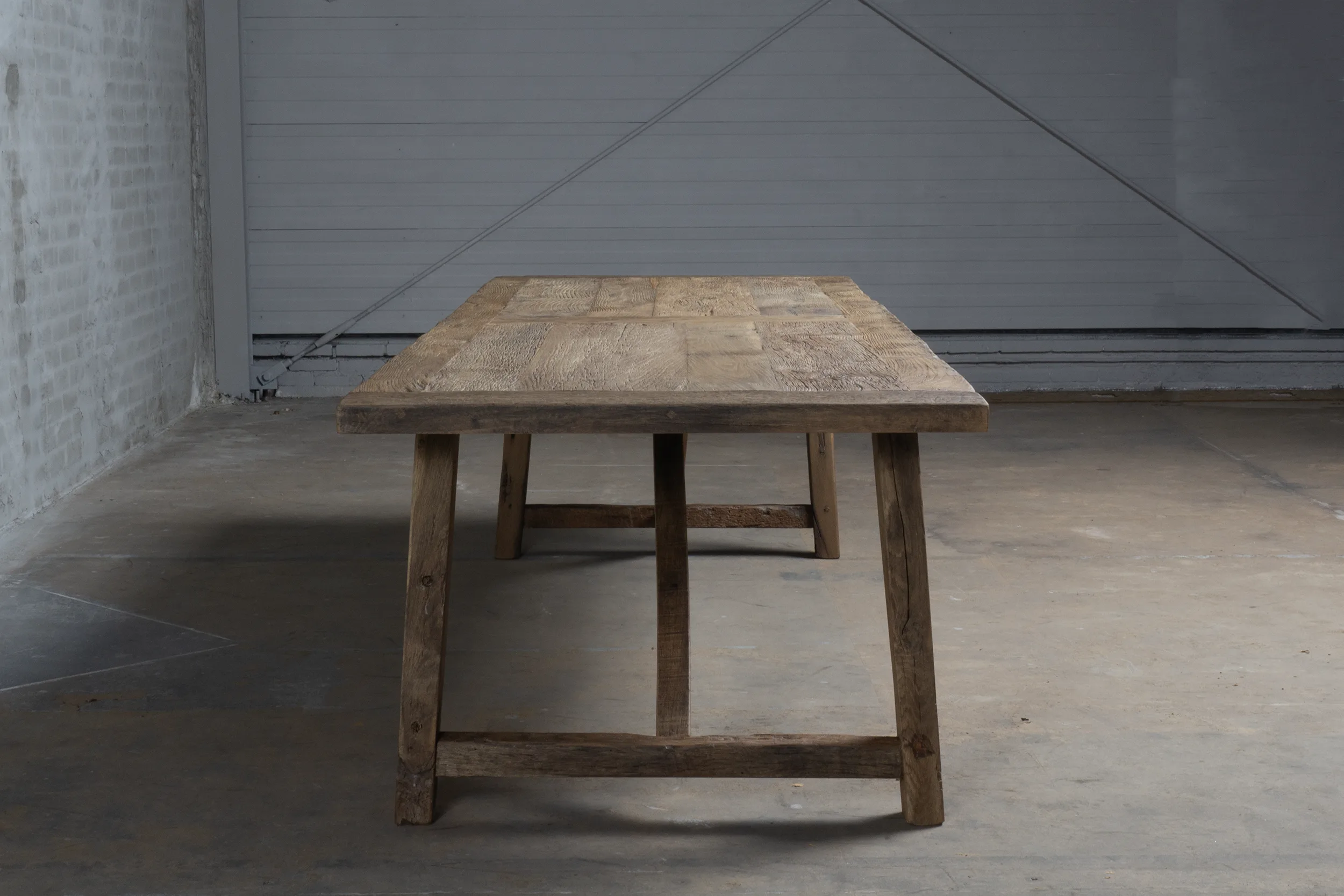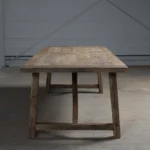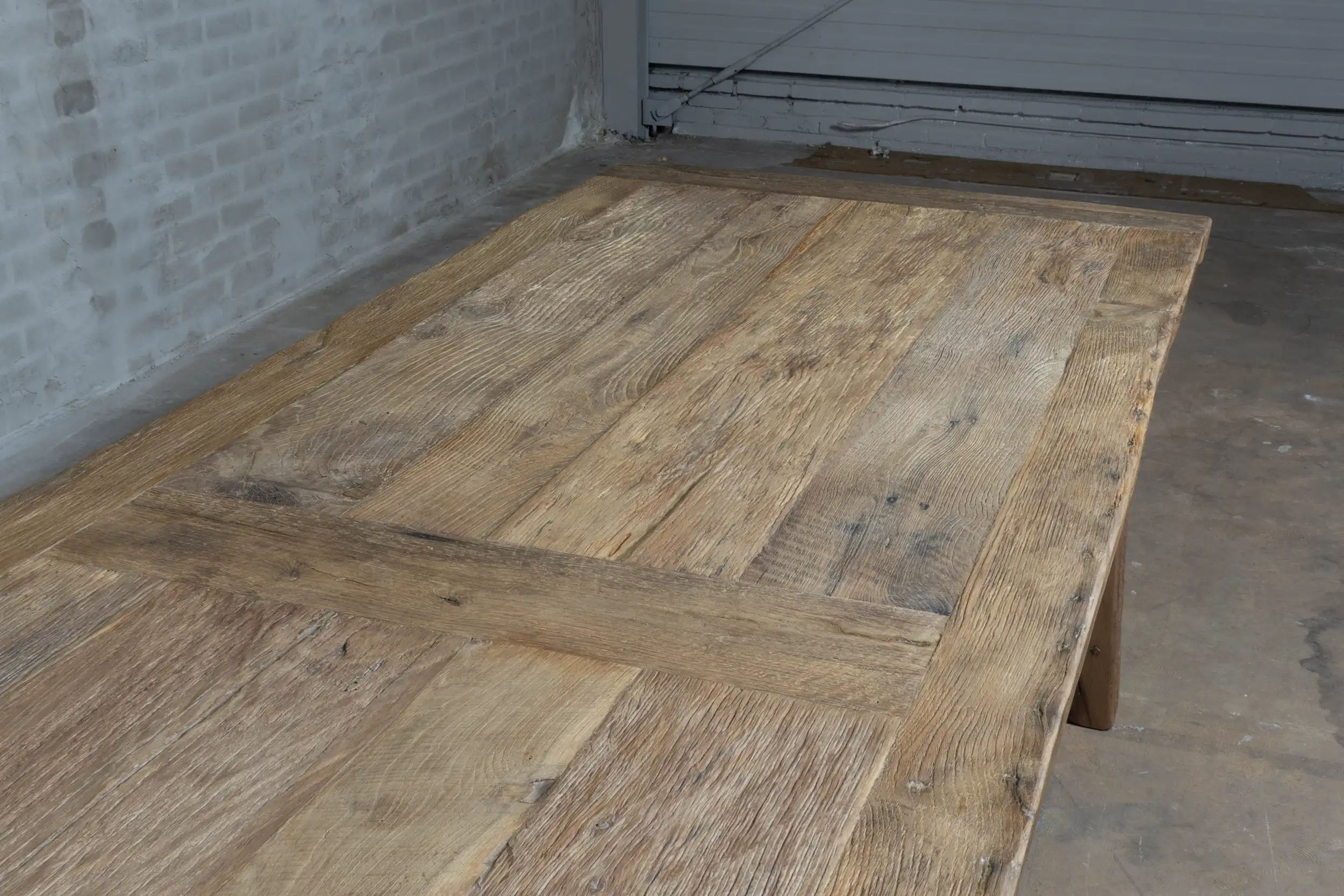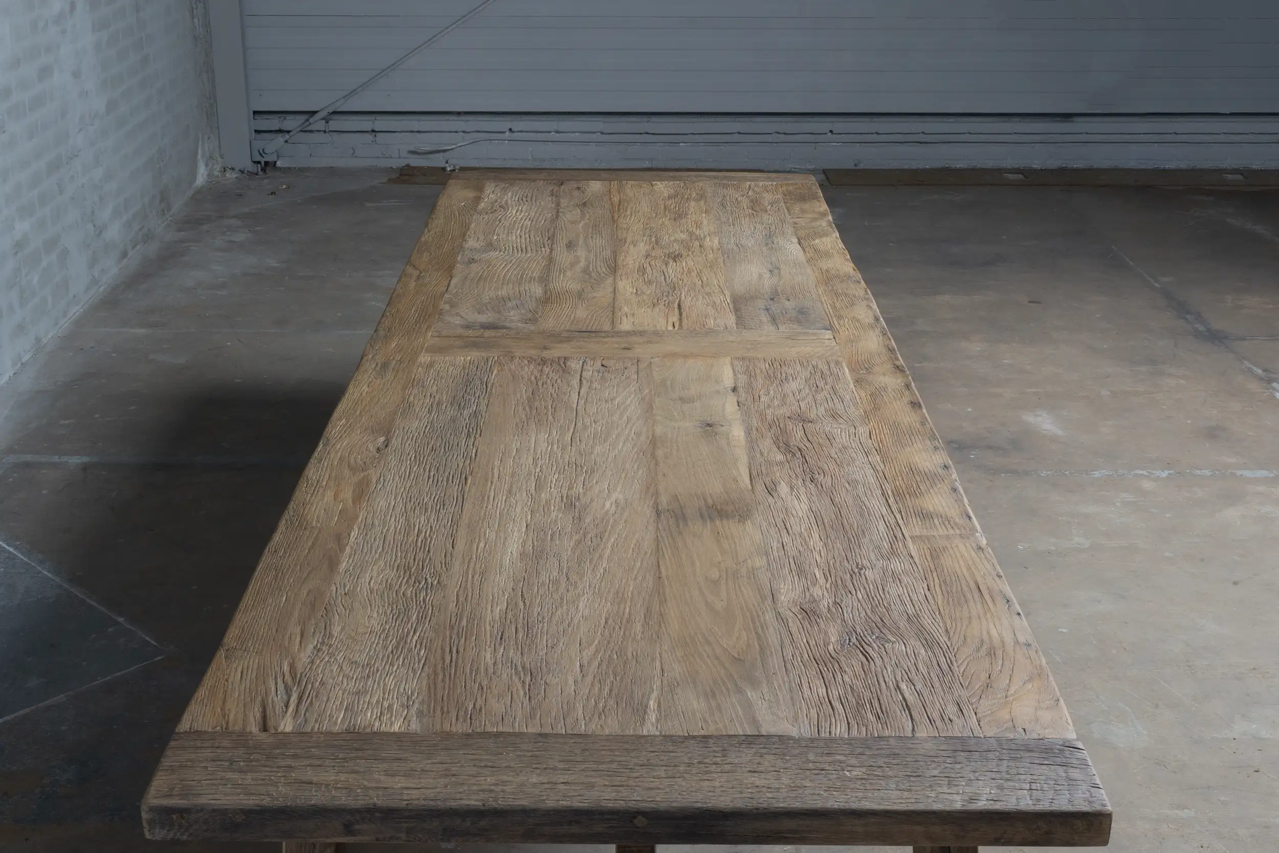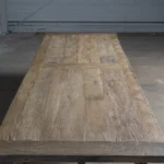 The table top, approx. 4 cm thick, is made of thin sunburned old oak wood (sawn from the outside of old beams) glued to a furniture board. The outer edges are made of solid planks. Because the oakwood has been coloured in the sun for decades as cladding, it has acquired a beautiful patina.