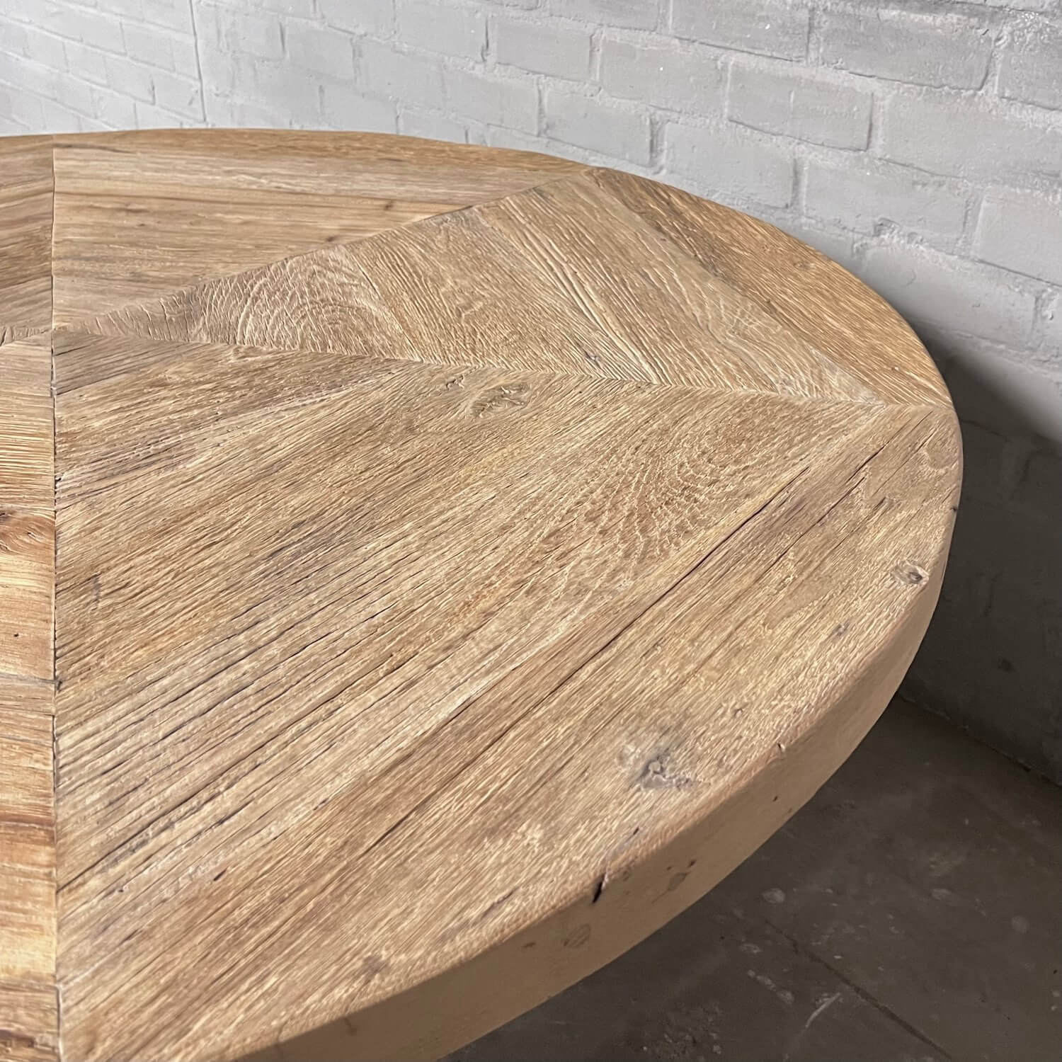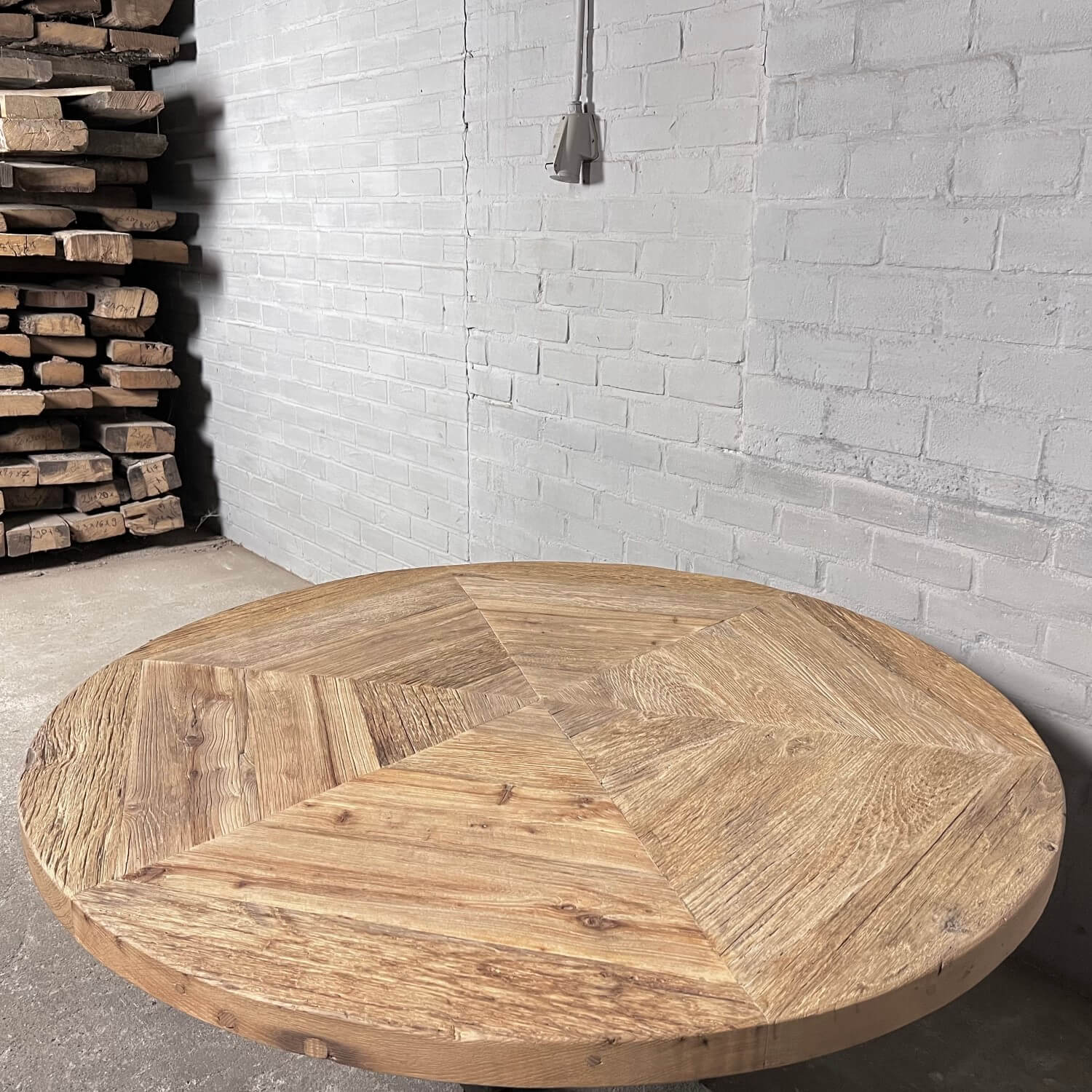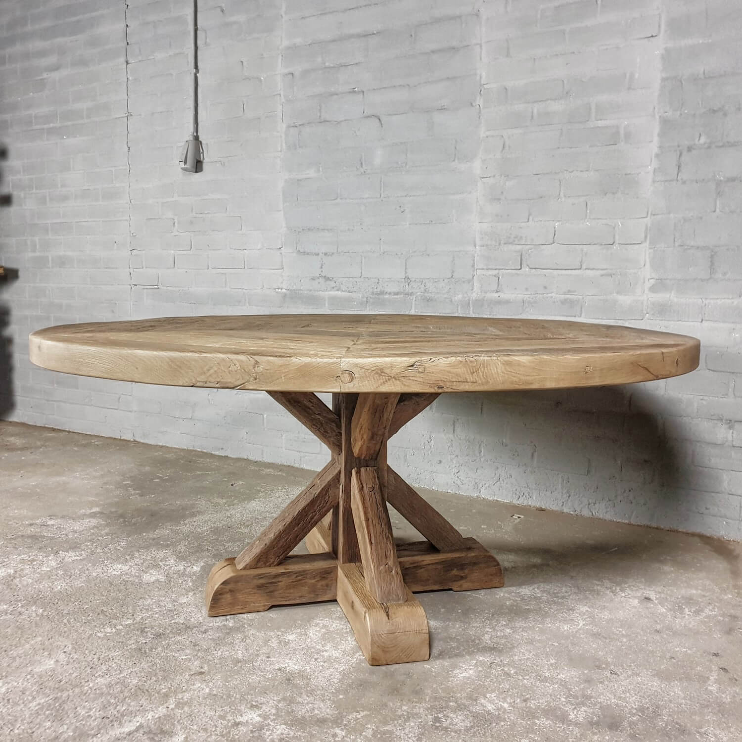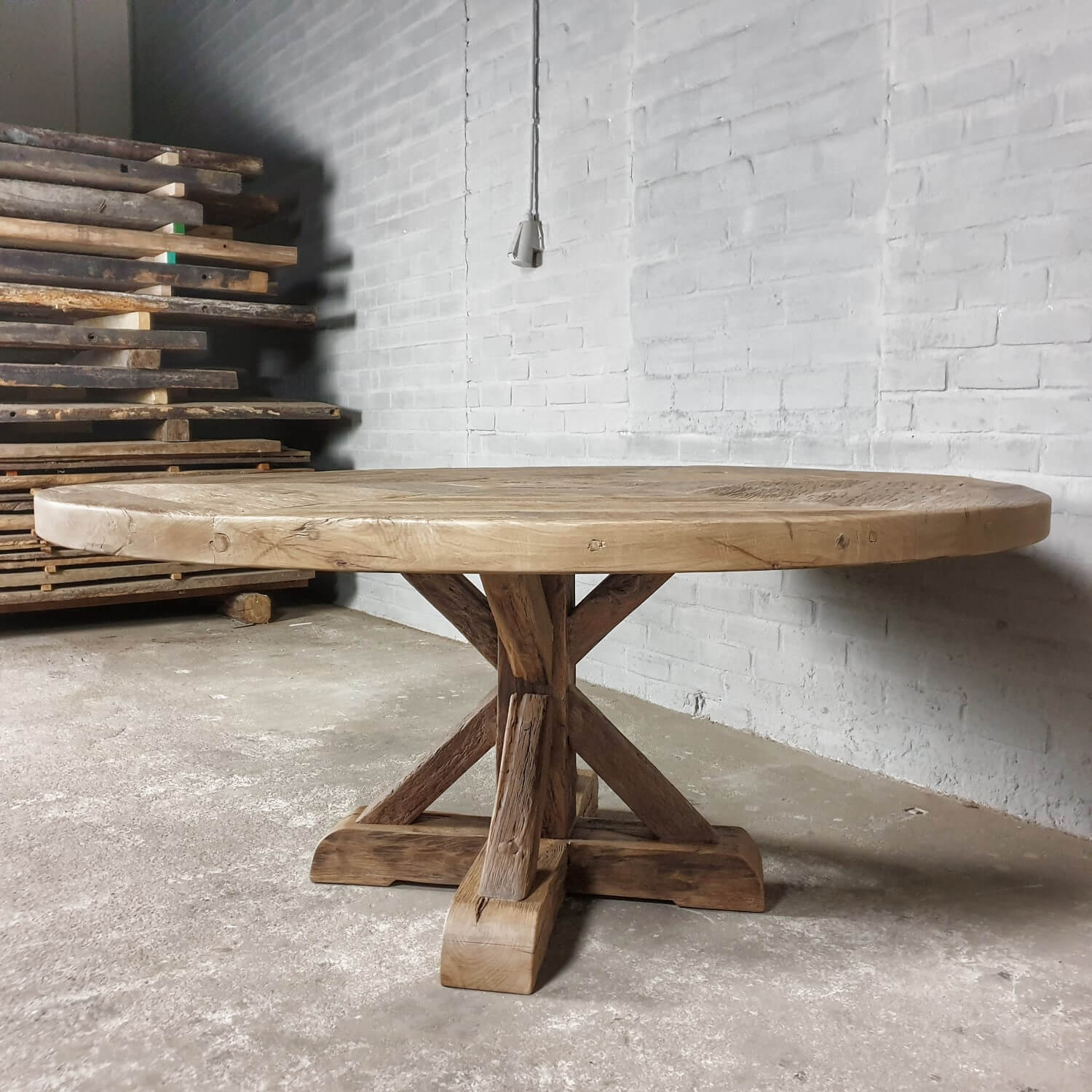 This round reclaimed oak Refectory table “Basel” is designed by ourselves and is made in our own workshop.