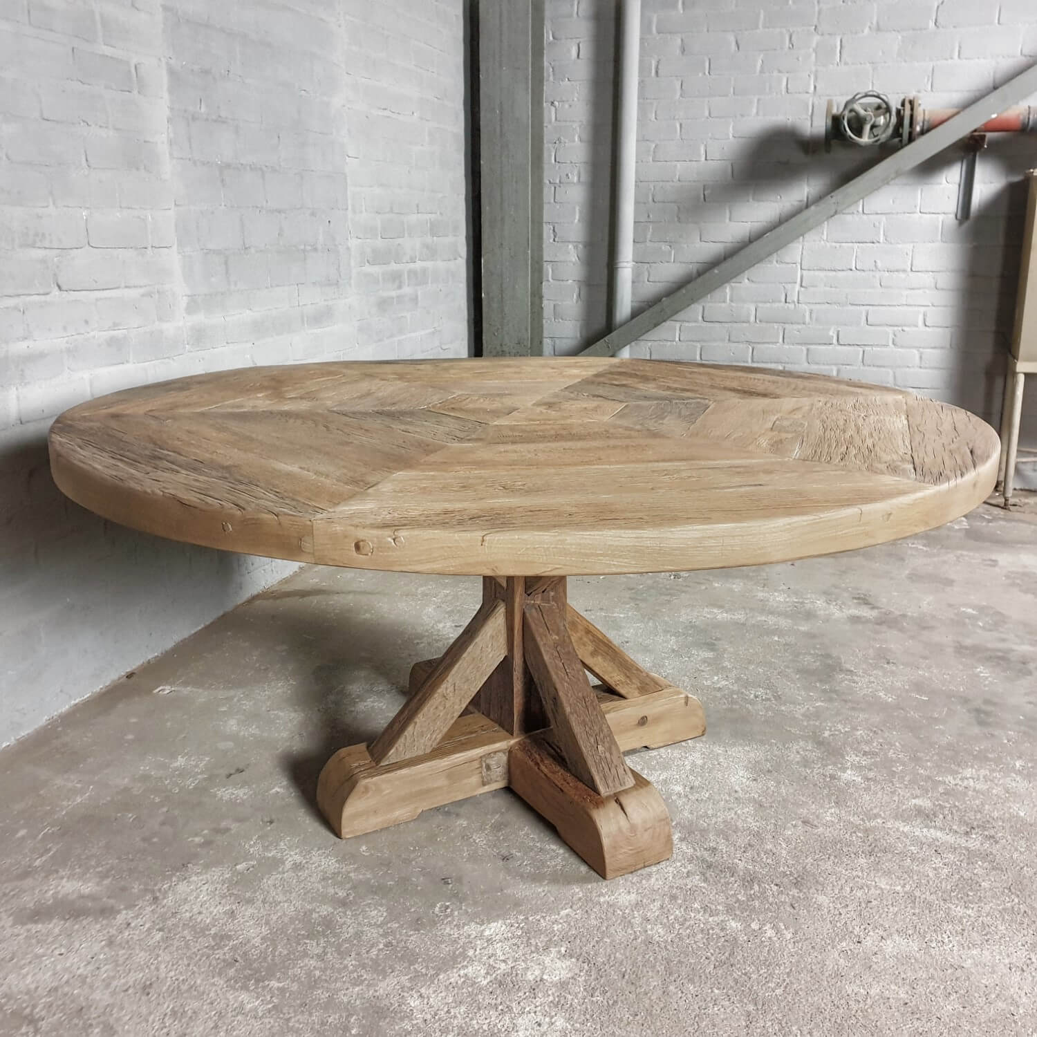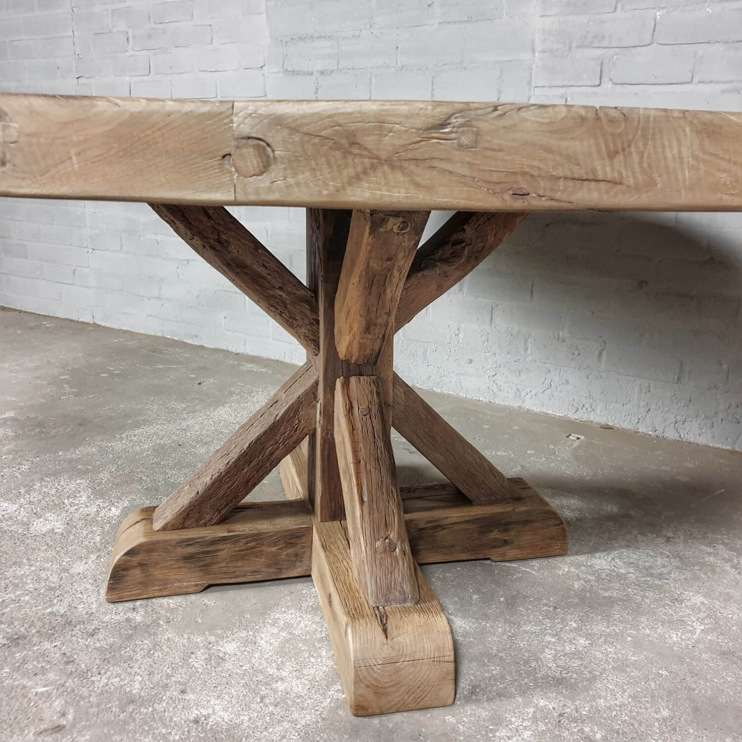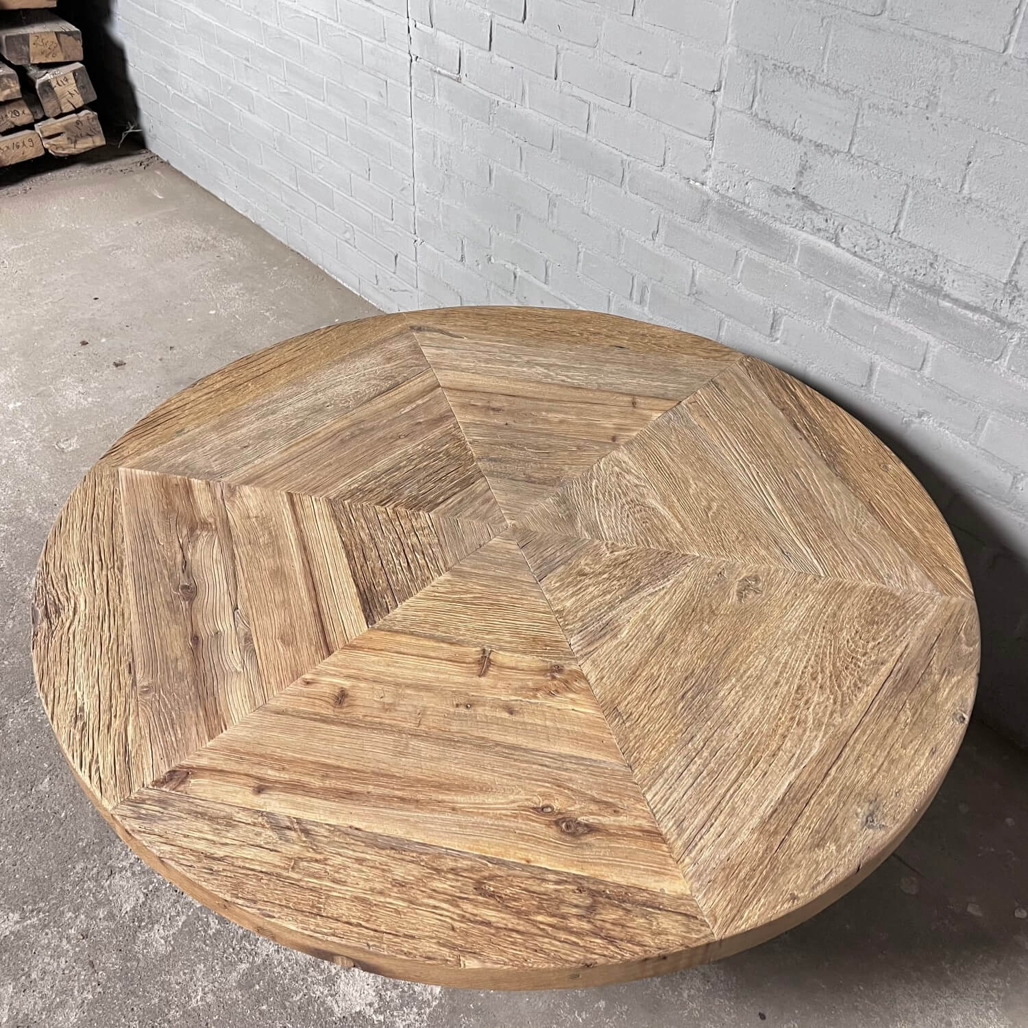 This round reclaimed oak Refectory table “Basel” is designed by ourselves and is made in our own workshop.