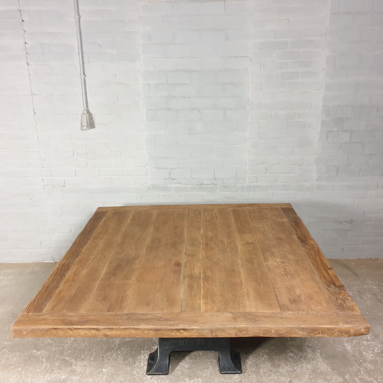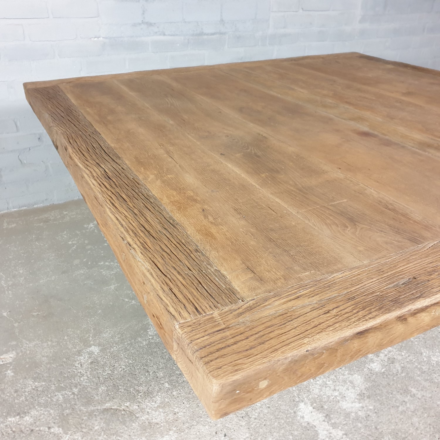 The tabletop is 7cm thick and made of thin old sunburned oak (sawed from the outer layer of old beams) that is glued on a furniture board. The outer edges of the tabletop are made of solid planks. The sunburned oak boards are from old houses, and have a beautiful patina tinted by the sun!